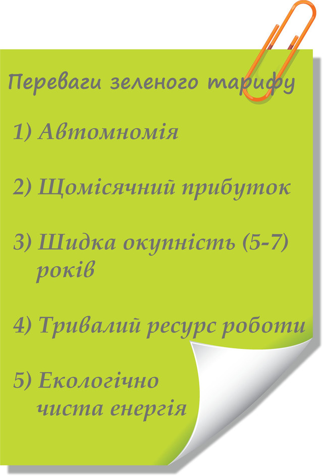 Зелений тариф на електроенергію - це економічно вигідний механізм фінансового стимулювання, використовувати відновлювальні джерела енергії. Завдяки програмі зелений тариф на електроенергію фізична особа має змогу економічно вигідно продавати надлишкову електроенергію, державному енергоринку за ціною в декілька разів більшою (0,163 євро за 1 кВт) ніж стандартний тариф споживання для населення, та в додаток не платити за власне електроспоживання.