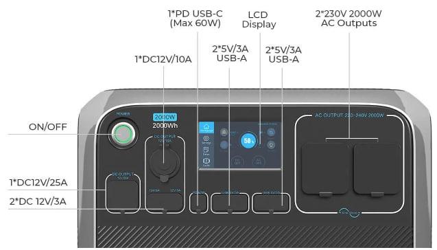- Інвертор змінного струму із чистою синусоїдою потужністю 2000 Вт (перенапруга 4800 Вт);